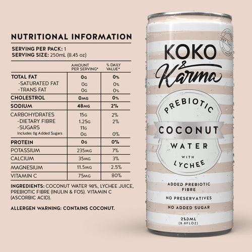 Koko & Karma Prebiotic with Lychee is a smooth gut tonic designed to support digestive health. Infused with prebiotic fibre from inulin and FOS, this light and refreshing blend nourishes beneficial gut bacteria while providing a naturally sweet taste from lychee and coconut water.